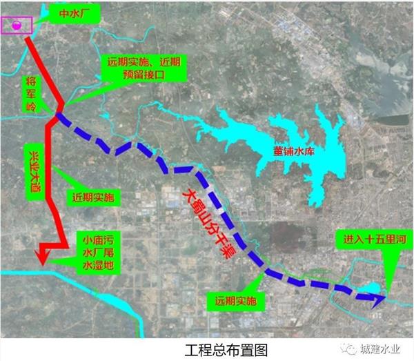 經建設單位和設計人員多次調研及現場踏勘,擬定了近期將長崗污水處理廠中水輸送至小廟進行再生利用,遠期將中水輸送至大蜀山干渠提供生態基流的近遠期結合方案,本次近遠期結合的方案實施。