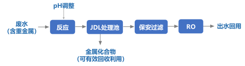 JDL工藝集固液分離、固體懸浮物濃縮、廢水處理回用、重金屬資源回收于一體,實現了“廢水處理回用+重金屬資源回收”的重金屬廢水處理模式;出水水質達到相關行業重金屬廢水排放標準,回收重金屬可作為相關產品直接利用,顯著減少了剩余危廢物,實現了廢水中有價金屬的資源化,一定程度上緩解了重金屬危廢處理難題;處理過程中不加入聚丙烯酰胺(PAM)、鐵鹽、鋁鹽等絮凝劑,使膜組件不易堵塞。